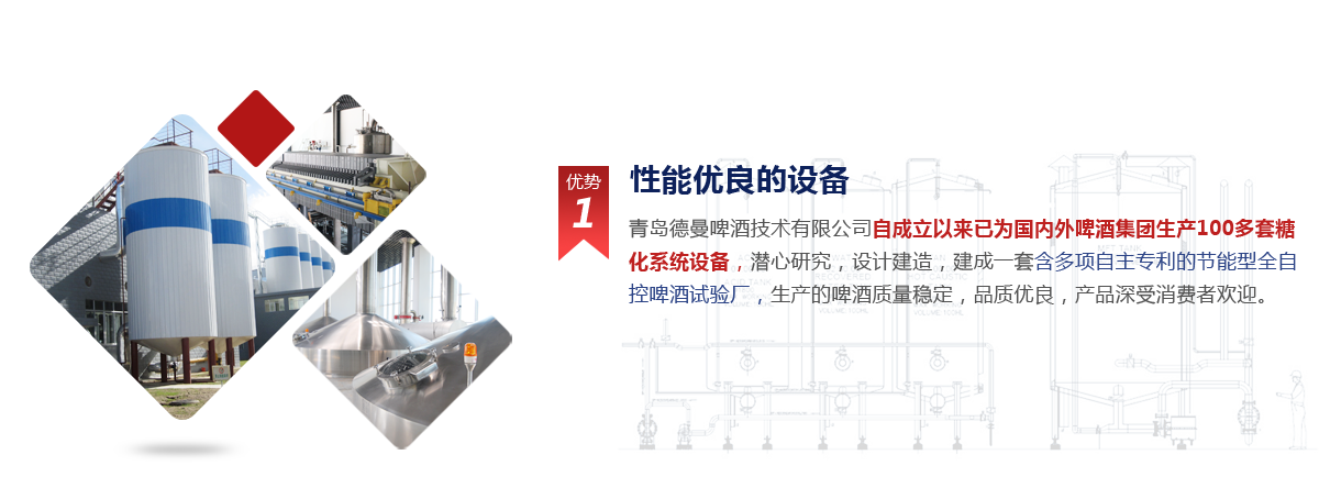 青島德曼啤酒技術(shù)裝備有限公司成立于1999年6月16日,自公司成 立就與德國(guó)HUPPMANN公司(歐洲著名的啤酒糖化設(shè)備制造商)合作,經(jīng)過(guò)多年的刻苦努力,持續(xù)不斷的合作、學(xué)習(xí)、研究、進(jìn)取,對(duì)啤酒釀造工藝的成熟理 解和設(shè)計(jì)、制造、施工、調(diào)試、投產(chǎn)全過(guò)程實(shí)際工作的積累。